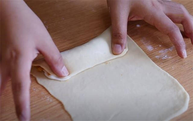 5.擀成饼皮之后,我们在末端的位置放一些素肉松,再挤一些沙拉酱,然后用底部的这层皮先把馅料包起来。
