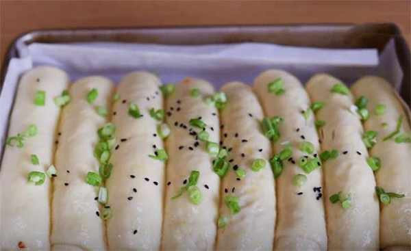 7.二次发酵,面团的体积会膨胀了很多,这时候在表面刷一层食用油,撒一层葱花,再撒一些黑芝麻。