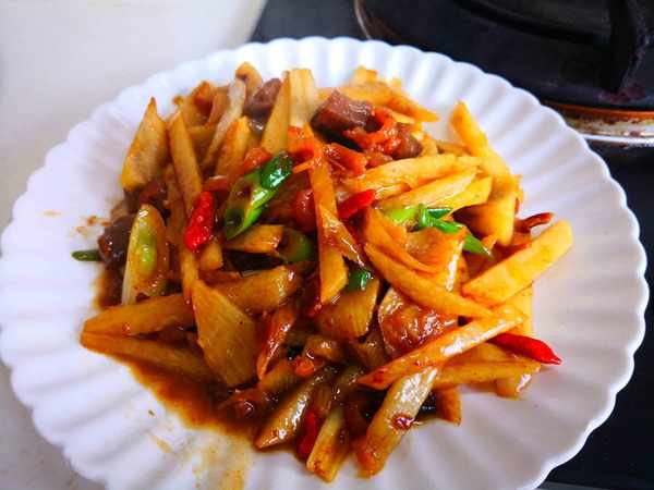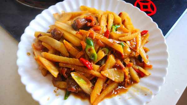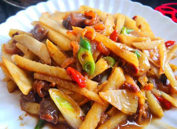 3.锅中烧油,油热后放入葱花,大火翻炒至少葱花出香味后倒入一勺豆瓣酱,继续翻炒出酱香味后,把切好的海参和山药倒入,翻炒均匀后加入少许清水,然后再继续翻炒1分钟后放入虾仁和枸杞,翻炒片刻后加食盐、酱油和少许香油,大火炒匀后就可以关火出锅啦,又香又下饭!