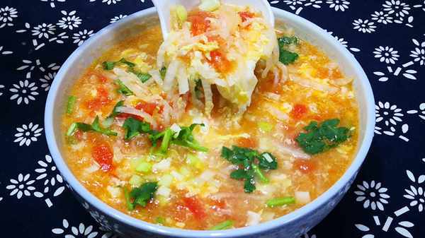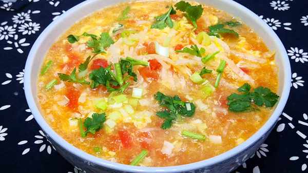 1.取半根白萝卜去头去尾,然后削去外皮,再切成细丝备用;一个西红柿打十字花刀放到碗里,倒入开水烫一下,然后撕去外皮后切成小丁备用。再准备适量的葱花和香菜段备用。