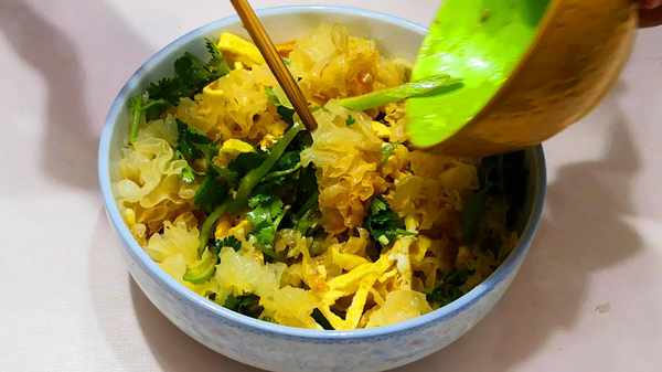 4.接着准备适量的葱丝、香菜段和辣椒丝放入碗中,加入撕碎的银耳、切好的鸡蛋条,再将调好的凉拌汁倒入,搅拌均匀后装盘即可,清凉爽口又下饭。