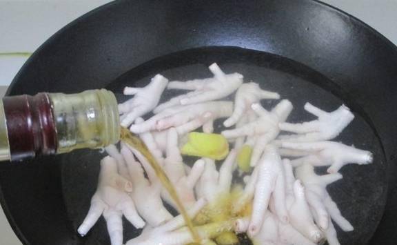 先把凤爪下冷水下锅,加入姜片和黄酒