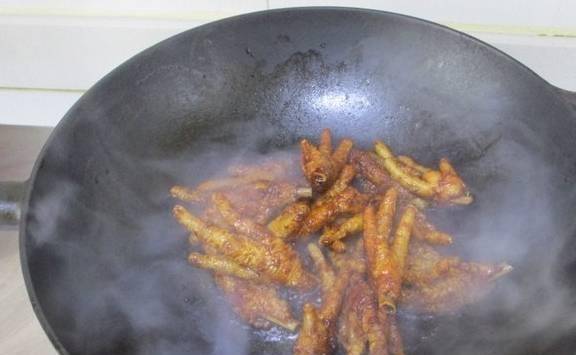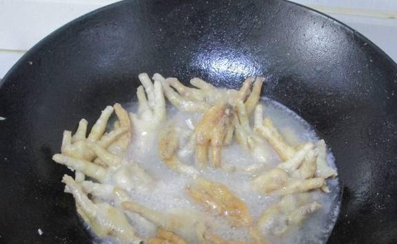 热锅油烧热,倒入鸡爪后立即盖上锅盖,炸至颜色金黄,捞出