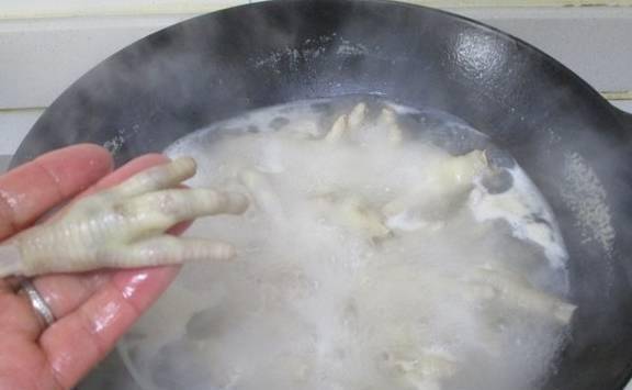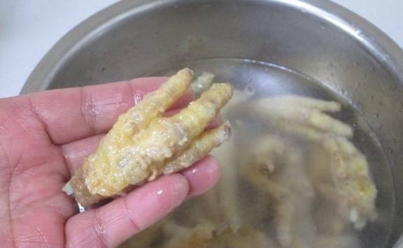 立即用冷水浸泡,泡至鸡脚皮起皱,捞出
