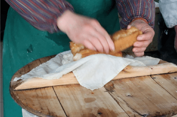 他熟练地将一长条白白的面团抖进油锅,再慢慢拉长,炸至金黄,翻面,两三分钟,一根油亮金黄的油条出炉。
