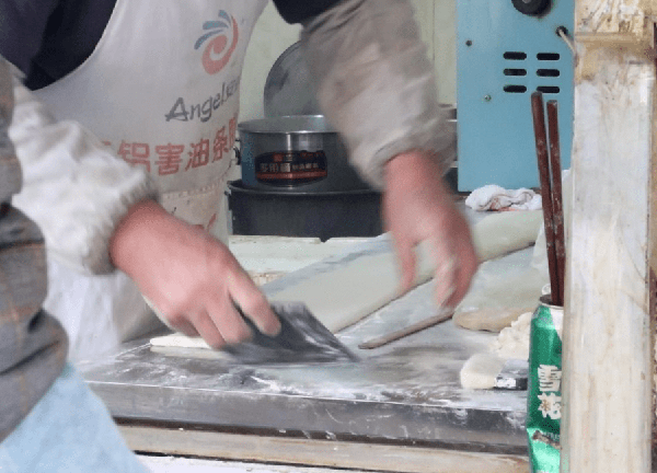 宜城街道东虹路这家早餐店里,四五十岁的阿公面前摆着一团面团、一双筷子、一把切刀和些许面粉。