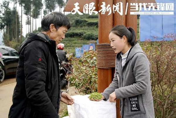 冉桂琴一边和乡亲们聊天,询问他们采茶、售茶和收入情况,一边认真地对比着茶青的成色。一拨人散去后,她上前与陈昌华交谈,详细询问不同价格的茶青哪些区别。