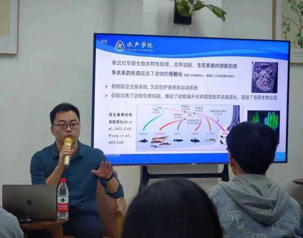 在谈及研究经历时,万世明详细介绍了自己跟随团队带头人高泽霞教授在鱼类肌肌间刺领域的学习与工作经历,与同学们一起观看了中央电视台关于无刺武昌鱼的新闻报道,带领同学们了解了无刺武昌鱼的研发历史与成果动态,同学们纷纷表示会持续关注无刺武昌鱼的研究进展。万世明表示,新品种的上市和推广还需要多方面的努力,研究团队将继续在鱼类肌间刺的发育机制解析和其他无刺鱼品种的培育上开展工作。