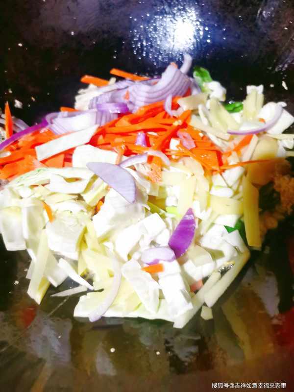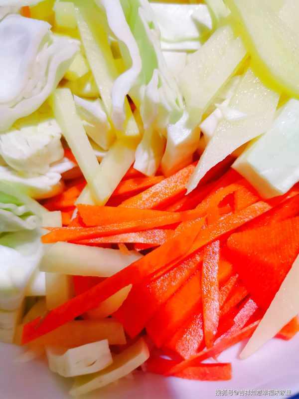 把胡萝卜和土豆削皮后清洗干净,切成细丝,洋葱和莲花白、葱,清洗干净切丝,所有食材都准备好放入盘中备用。