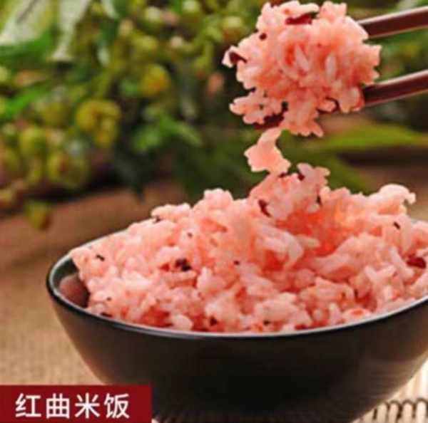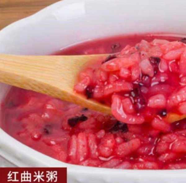 红曲米粥 按照平常熬粥的做法,大米与红曲米的比例为10:1,可以做出非常漂亮的粉红色米粥。