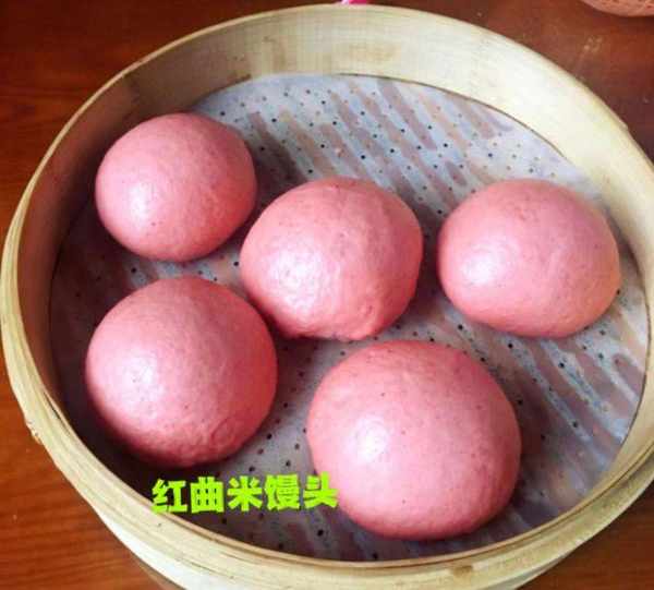 红曲米馒头 取红曲米粉按1:5与面粉混合,照平时蒸馒头的方法操作即可。