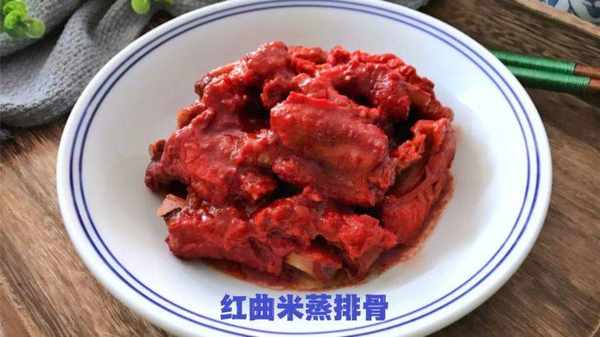 红曲米蒸排骨 小排洗净加葱姜及花椒、八角、盐、生抽等腌40分钟;将大米与红曲米按2:1混匀,放入干锅中炒至大米成焦黄色盛出打成粉,包裹在腌好的排骨外面,上锅蒸1-1.5小时。