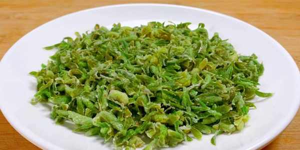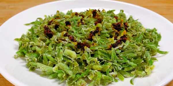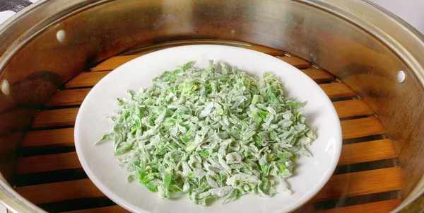 4、把裹满干面粉的柳芽全部倒在蒸蝶内,把蒸蝶放在蒸屉内,扣盖盖子蒸10分钟,中途把柳芽翻下面,避免柳芽蒸不透,时间到后直接关火端出来就可以。