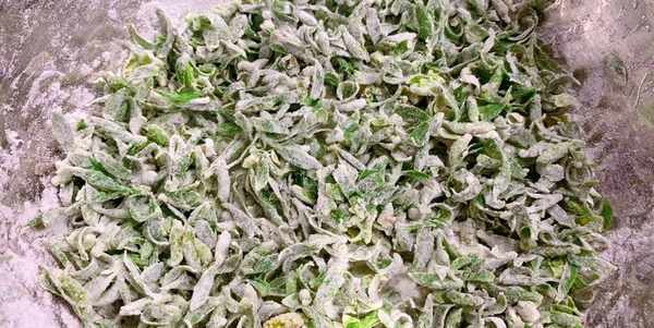 3、准备适量的干面粉,面粉内加入少许的胡椒粉和盐,把它搅拌一下,然后倒入攥干水分的柳芽内,双手抓拌一下,柳芽表面的水分一定要晾干,不然粘满面粉后成坨,蒸的时候生熟不均匀,而且也不好吃!