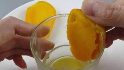 第3点,芒果盛行的时候总喜欢买来吃,但是果核很大,吃起来总是很不容易,其实很简单,用一个玻璃杯,将芒果在玻璃杯上摁着滑下来,果肉就都遗留在杯子里了。