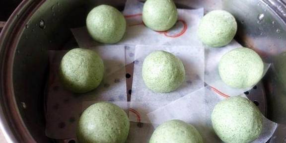 10.将做好的青团依次放入垫有张油纸防粘的蒸格上。