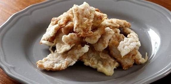 炸至猪肉片表皮酥脆,有点微黄的样子即可出锅。