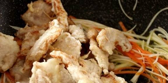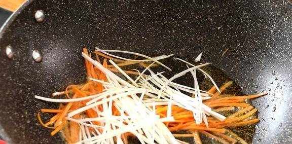 锅内留底油,下胡萝卜丝翻炒,再倒入大葱丝翻炒均匀。