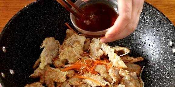 倒入炸好的猪肉片翻炒均匀,把调好的汁倒入锅内,炒匀后,撒上香菜段即可出锅。