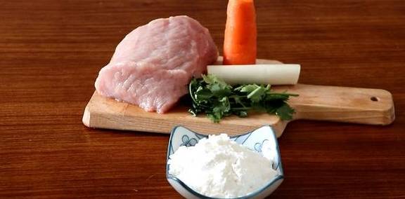 里脊肉,大葱,香菜,胡萝卜,淀粉,生抽,盐,糖,米醋,料酒,白胡椒粉,油。