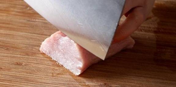切好的猪肉片加盐、白胡椒粉、料酒腌制一下。