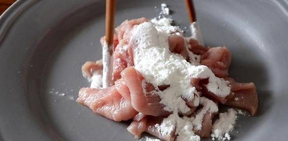 加一点干淀粉,搅拌均匀,把每片猪肉片的均匀的裹上一层薄淀粉。