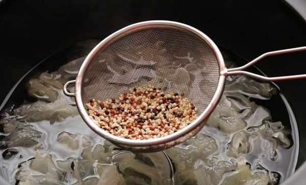 把藜麦也倒进锅中,继续煮制15分钟。藜麦不同于其他粗粮,它比较容易煮熟,当看到藜麦煮出芽来就说明熟透了。