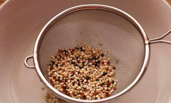 取藜麦一小把,放在碗中,加入清水浸泡1小时。藜麦泡好后,把水倒掉,多用清水冲洗几次。提醒您,泡藜麦的水不要用来烹饪,不仅可以去掉涩味,还可以去除掉皂甙成分。