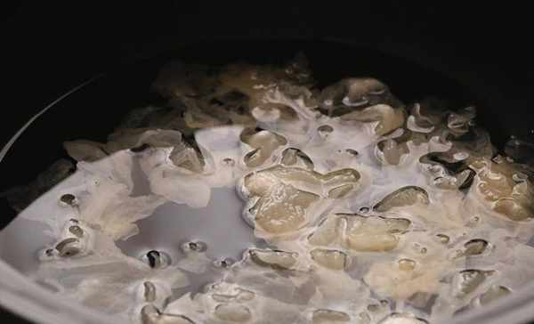 银耳泡好后把底部的根蒂剪掉,用清水冲洗干净,再把银耳撕碎,这样煮制时出胶更快。把银耳倒入砂锅中,加入适量的清水,大火煮开转成中火煮20分钟,中途要适当搅动一下。