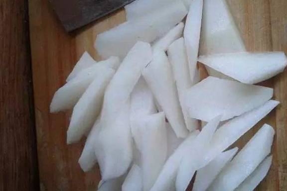 2、先把大米开水下锅,小火熬煮起来。然后把山楂洗净,将山楂肉切成小片,待用。再将雪梨和白萝卜去皮、擦丝。