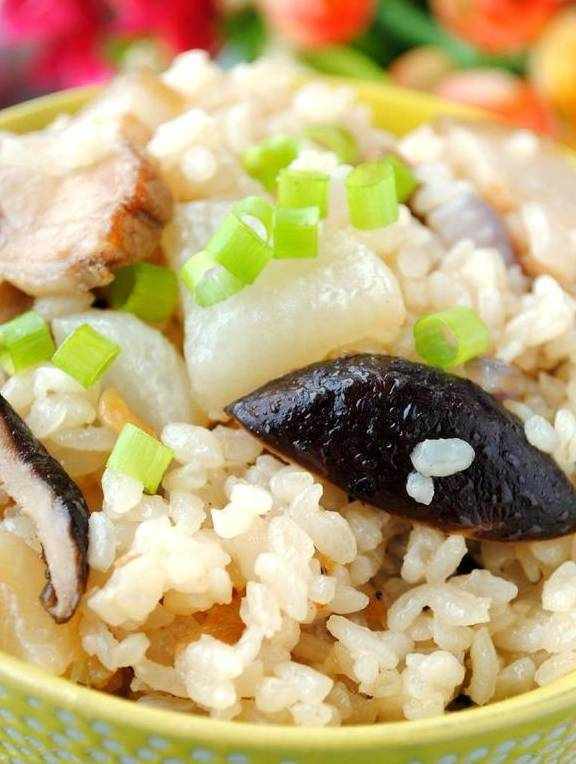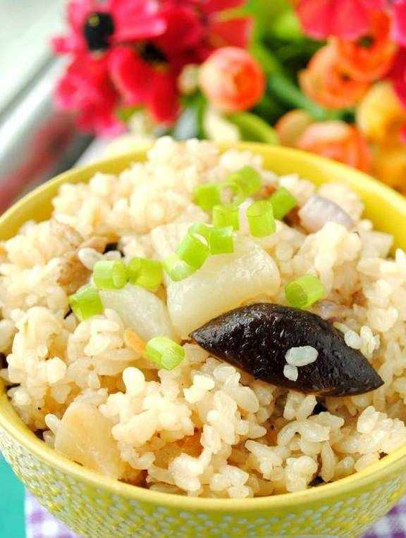 7.大米洗净,将菜全部倒入电饭煲内胆中,加入泡过香菇的水,加入泡过虾皮的水,水要适量。然后按下电饭煲的米饭键,自动工作半小时。