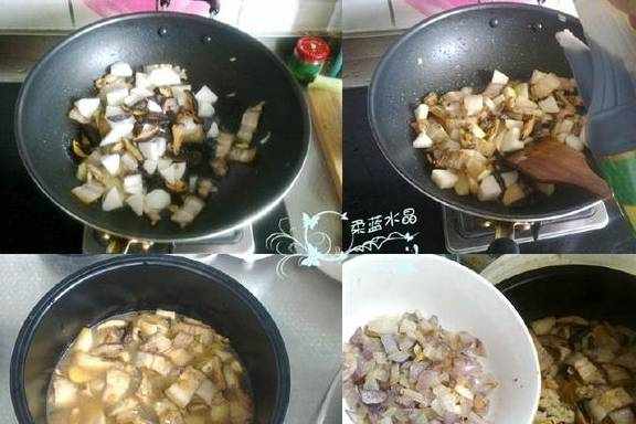 5.锅里留底油,放入切好的五花肉翻炒,再放入葱姜蒜。倒入香菇丁和白萝卜块,以及泡过水的虾皮,虾皮要控干水再放。
