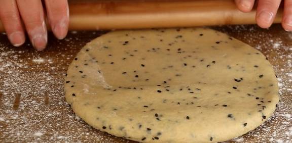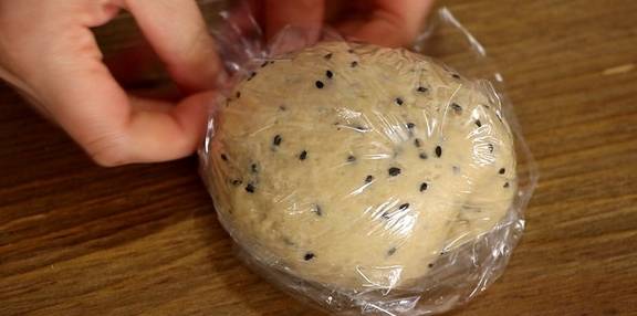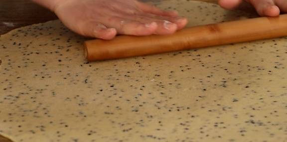 把揉好的面团封上一层保鲜膜,醒面半小时。面团醒好以后取出,用擀面杖擀成大薄片。如果比较粘的话可以撒上一点干面粉。