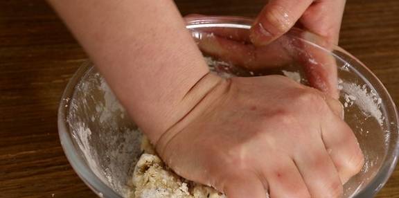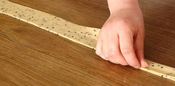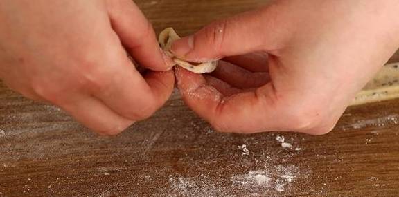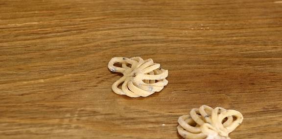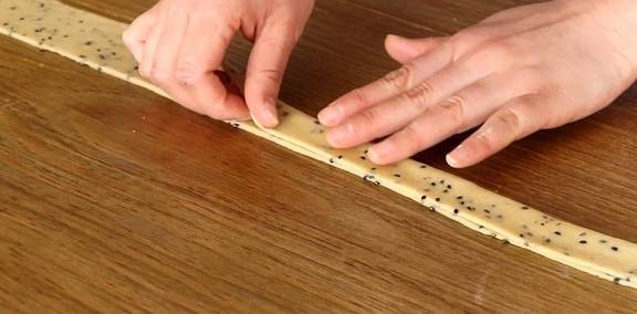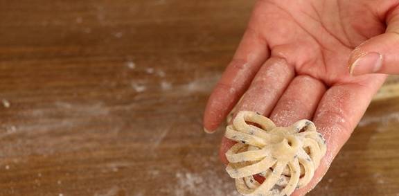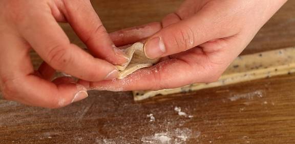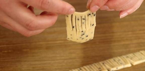 把切好的面片斜对角捏在一起,两边的角都一起往中间捏,就形成好看的花型。