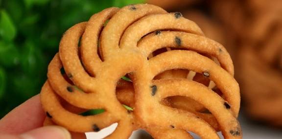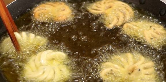 锅内倒油,油烧至五六成热的时候,下半成品的麻叶炸,炸至金黄酥脆的样子即可捞出,咬一口特别酥脆。