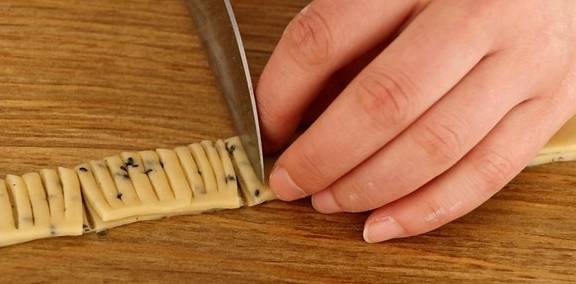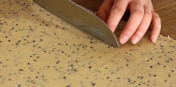面片切长条,切好的皮子对折,用刀切丝,但不要切段,每十刀切断一次。