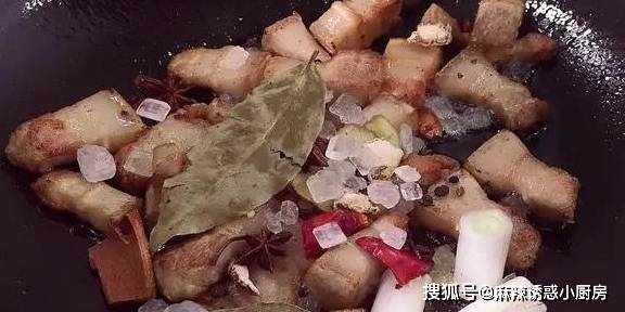 步骤四:把糖炒到颜色微红,这个时候就可以把猪肉放进去了,进行反复的煸炒,把猪肉中的水分炒干(猪肉的颜色变成透亮、表面微黄,说明这个猪肉炒够),炒到猪肉金黄(这时候猪肉会在锅里噼里啪啦响)加入酱油(要提前放入酱油,这样才能更好激发出酱油中香味)