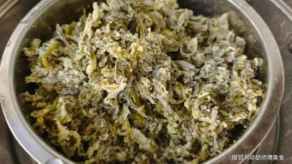 【食材准备】:苦菜500克、前夹肉300克、泡胀的黑木耳10克(可不要)、食盐、姜末、