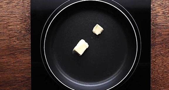 4.准备平底不粘锅,将黄油放入煎锅中,小火加热直到黄油融化。