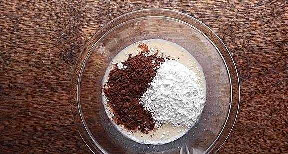 3.蛋糕粉过筛倒入碗中,然后再加入可可粉,用打蛋器继续搅拌,直到所有成分混合成面糊即可。