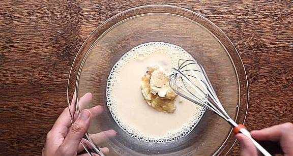 2.将香蕉的一半切成1厘米宽的切片,将其余的放入碗中,然后用叉子将其压碎,直到变成泥状。然后倒入牛奶鸡蛋的碗中,继续搅拌均匀。