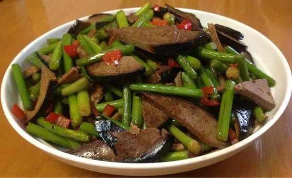 猪血、青蒜、油适量、盐适量、宴友食用油、糖适量、姜适量、辣椒适量、葱适量、料酒适量、鲜抽适量