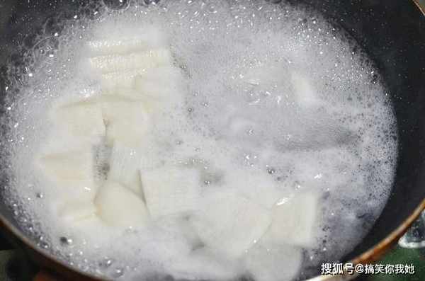 戴上一次性手套,把山药外皮削掉,改刀切成薄片,起锅烧水,水开下入山药片,焯水两分钟左右,捞出控干水分。
