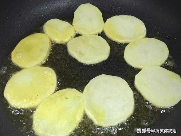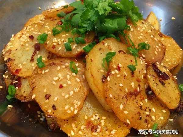 起锅烧油,油不要倒太多,依次放入土豆片,煎一煎正反面,煎至色泽金黄,即可捞出,再加些油,依次放花椒粒、蒜片、豆瓣酱炒出红油,土豆片再次下锅,炒匀即可出锅,撒上一层白芝麻点缀一下。