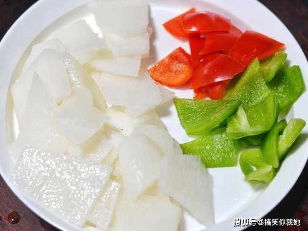 切一些青红椒,作为配料使用,另外调一碗料汁,小碗中依次加入适量食盐、白糖,半勺白醋、一勺淀粉、五勺清水,搅拌均匀。