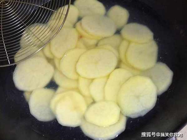 起锅烧水,水热下入土豆片,烫上20秒钟即可,快速捞出,时间太久了,容易烂掉,放在一边控干水分。