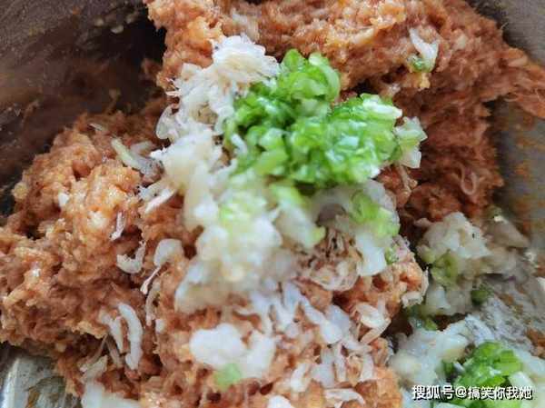 接下来开始处理肉馅,肉馅中依次加入生抽、老抽、蚝油、花椒粉、芝麻香油、食盐、葱碎,再淋入半碗花椒水,花椒水起到去腥作用,边倒边搅动,直至完全吸收。