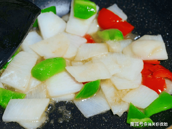 起锅烧油,先下入青红椒翻炒,接着放入山药,等炒断生以后,再倒入调好的料汁,等稍微黏稠以后,就可以出锅了。