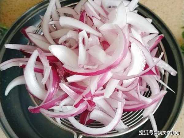 准备两个鲜嫩的洋葱,剥掉外皮,改刀切成细丝,想要洋葱不辣眼睛,可以提前在冰箱冷藏一会儿,可有效防止辣眼。
