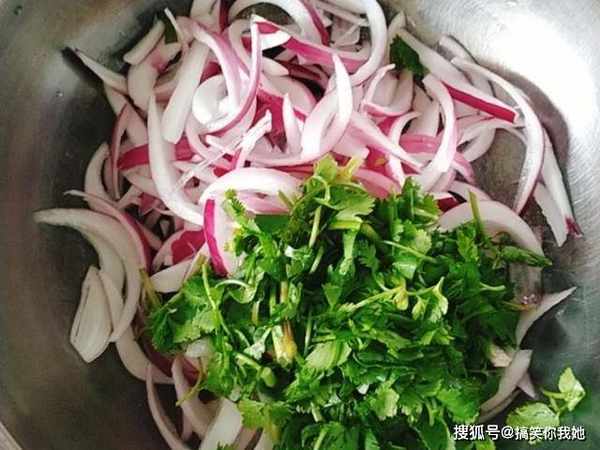 新鲜的洋葱,不用清洗,内部也不会脏,不用担心,切一些香菜放进去,下一步开始调味。